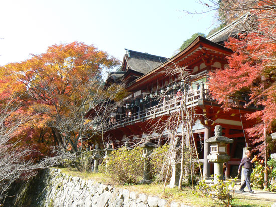 | 長谷寺 マップ 桜井市にある真言宗豊山派(ぶざんは)総本山の寺。本尊は十一面観音。西国三十三箇所観音霊場の第八番札所。大和と伊勢を結ぶ初瀬街道を見下ろす初瀬山の中腹に本堂が建つ。初瀬山は牡丹の名所で、4月下旬〜5月上旬には150種類以上、7,000株が咲き誇る、古くから「花の御寺」と称されている。また「枕草子」「源氏物語」「更級日記」など多くの古典文学にも登場する。中でも「源氏物語」にある玉鬘の巻のエピソード中に登場する二本(ふたもと)の杉は現在も境内に残っている。 |