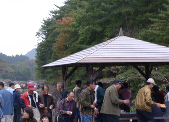 | 厳美渓の名物「かっこうだんご」は渓流をはさんだ対岸にお店があり川の上に張られたロープに下がる籠に注文と代金を入れて木槌を鳴らすと、籠は引き上げられて代わりに注文しただんごとお茶が入って降りてきます | |||